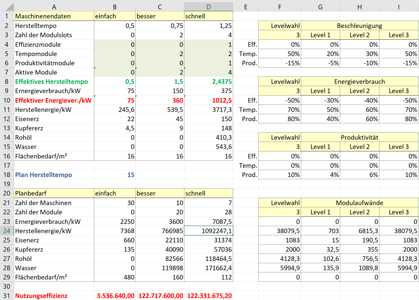Wir müssen noch berücksichtigen, dass die Produktivitätsmodule wirklich mehr Output aus dem gleichen Input erzeugen. Produktivitätsmodule machen die Maschine leider auch langsamer und benötigen Extra-Strom. Das Tempo und den Energieverbrauch haben wir ja schon ausgerechnet.